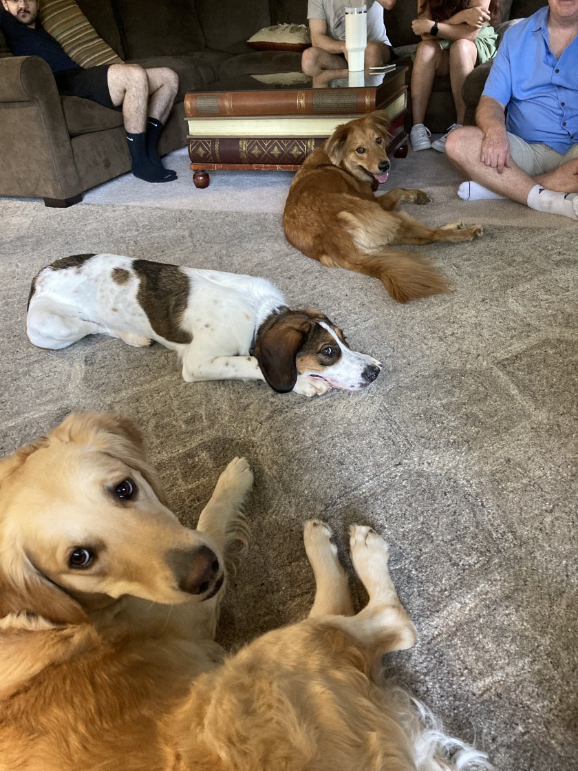 Golden retrievers are known for their intelligence and trainability, which makes teaching them a variety of words possible. Obviously, we expect our dogs to learn the words we use every day (walk, sit, ball, etc.), but when a dog knows the language, it means they interact with our language! This sometimes catches us unprepared- like when I say that I’m going for a “walk with my neighbor” but of course Dixie Rose only hears “walk” and thinks I’m taking her with me. I love that she knows so many words, and she’s not yet 3, but she is well on her way to a rich vocabulary. I think the key to good training (behavior) is sharing language. The desire to communicate and convey meaning allows a dog to understand what is expected of him or her. This eliminates the frustration of disobedience. Now I spell w-a-l-k, when I’m walking with my neighbor, but she’s on to me.